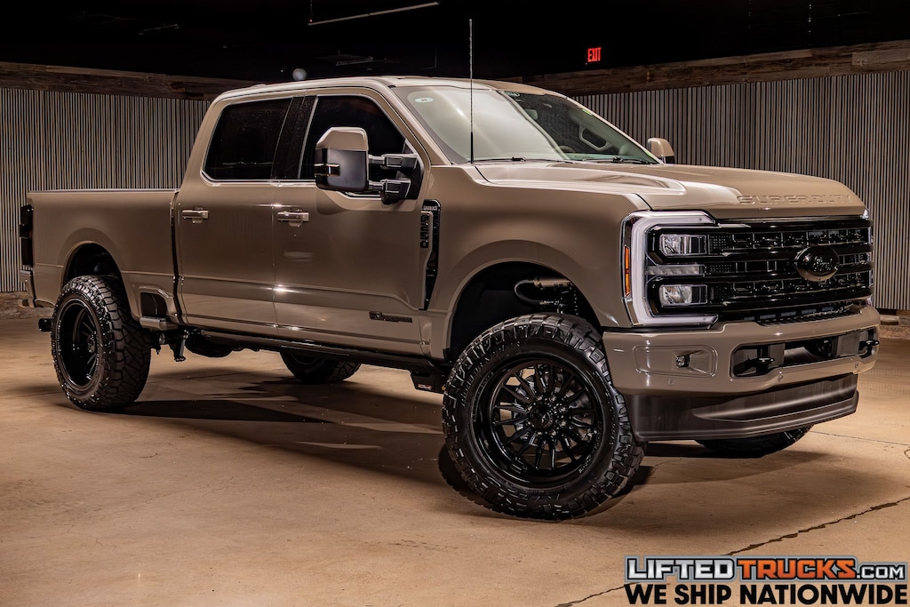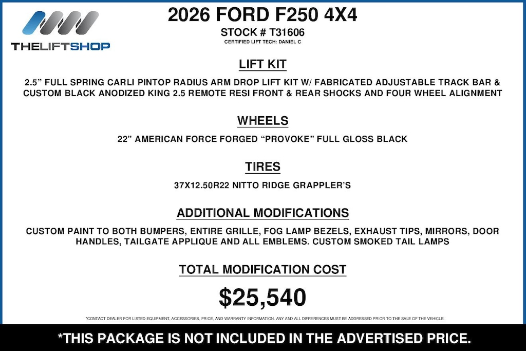 This Lifted 2026 Ford F-250SD King Ranch features a 2.5-inch Full Spring Carli Pintop Radius Arm Drop Lift Kit with Fabricated Adjustable Track Bar, Custom Black Anodized King 2.5 Remote Resi Front & Rear Shocks, Four Wheel Alignment, 22-inch American Force Forged Provoke Full Gloss Black Wheels, 37X12.50R20 Nitto Ridge Grappler Tires, Custom Paint Match, and Custom Smoke Tail Lamps. Installed by our Lift Tech, Daniel C. *Modifications are optional and are not included in the advertised price.*