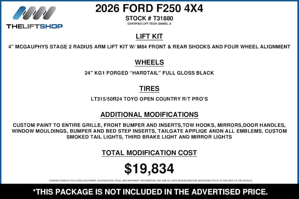 This Lifted 2026 Ford F-250 King Ranch Crew Cab 4X4 includes a 4-inch McGaughy's Stage 2 Radius Arm Lift Kit w/M84 Front & Rear Shocks and Four Wheel Alignment, 24-inch KG1 Forged "Hardtail" Full Gloss Black Wheels, LT315/50R24 Toyo Open Country R/T Pro Tires, Custon Paint to Entire Grille, Front Bumper & Inserts, Tow Hooks, Mirrors, Door Handles, Window Moldings, Bumper & Bed Step Inserts, Tailgate Applique, All Emblems, Custom Smoked Tail Lights, Third Brake Light and Mirror Lights. Installed by our Certified Lift Tech: Daniel A! *Modifications are optional and are not included in the advertised price.*