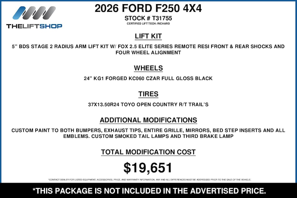 This Lifted 2026 Ford F-250 Lariat Crew Cab 4X4 includes a 5-inch BDS Stage 2 Radius Arm Lift Kit w/Fox 2.5 Elite Series Remote Resi Front & Rear Shocks and Four Wheel Alignment, 24-inch KG1 Forged KC060 Czar Full Gloss Black Wheels, 37X13.50R24 Toyo Open Country R/T Trail Tires, Custom Paint to Both Bumpers, Exhaust Tips, Entire Grille, Mirrors, Bed Step Inserts and All Emblems, Custom Smoked Tail Lamps and Third Brake Light. Installed by our Certified Lift Tech: Richard! *Modifications are optional and are not included in the advertised price.*