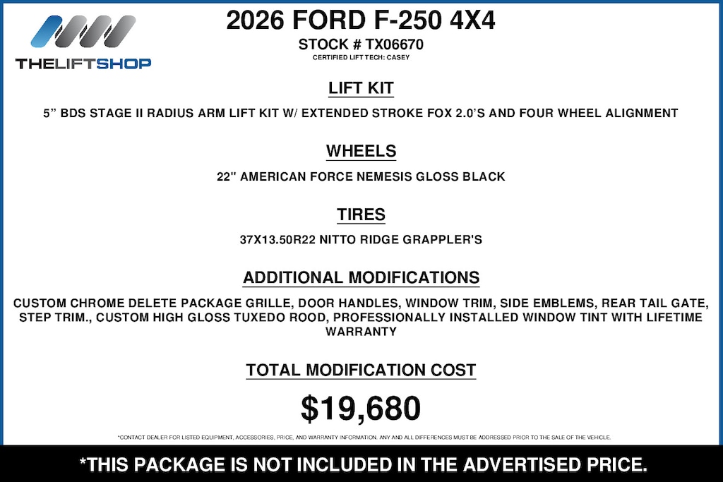 This Lifted 2026 Ford F-250SD Lariat features 5-inch BDS Stage II Radius Arm Lift Kit, Extended Stroke Fox 2.0 Shocks, Four Wheel Alignment, 22-inch American Force Nemesis Gloss Black Wheels, 34X13.50R22 Nitto Ridge Grappler Tires, Custom Paint Match, and Professionally Installed Window Tint with a Lifetime Warranty, Installed by our Certified Lift Tech, Casey. *Modifications are optional and are not included in the advertised price.*