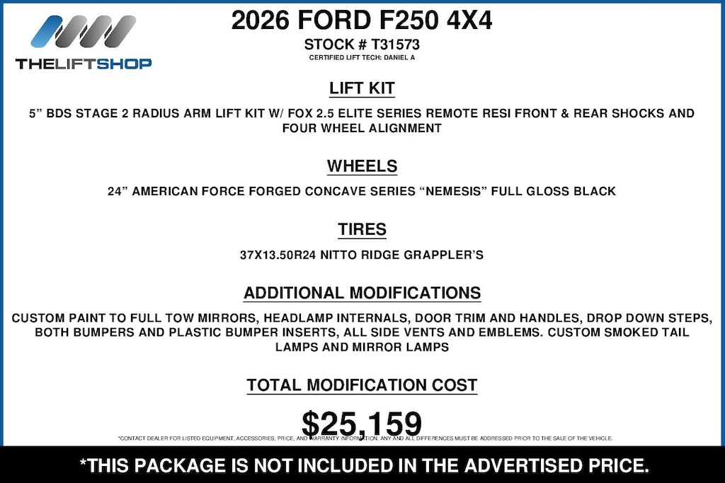 This Lifted 2026 Ford F-250 King Ranch Crew Cab 4X4 includes a 5-inch BDS Stage 2 Radius Arm Lift Kit w/Fox 2.5 Elite Series Remote Resi Front & Rear Shocks and Four Wheel Alignment, 24-inch American Force Forged Concave Series "Nemesis" Full Gloss Black Wheels, 37X13.50R24 Nitto Ridge Grapplers Tires, Custom Paint To Full Tow Mirrors, Headlamp Internals, Door Trim and Handles, Drop Down Steps, Both Bumpers, and Plastic Bumper Inserts, All Side Vents and Emblems, Custom Smoked Tail Lamps and Mirror Lamps. Installed by our Certified Lift Tech: Daniel A! *Modifications are optional and are not included in the advertised price.*