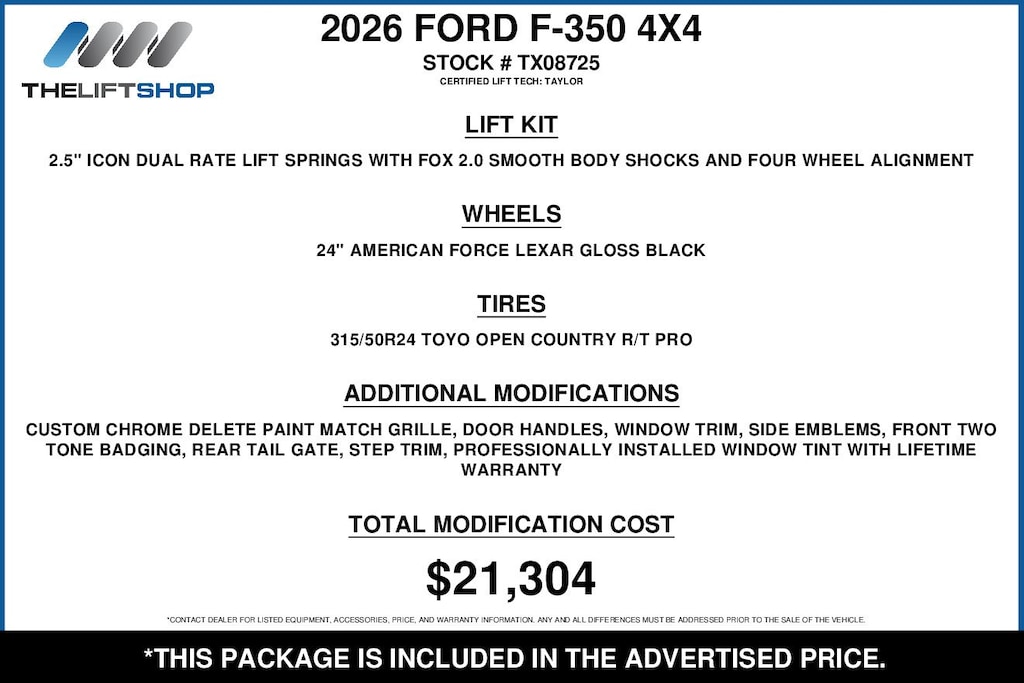 At Lifted Trucks, transparency is our priority. While we strive to provide accurate descriptions of our vehicles, please understand that errors may occur due to the human element involved in the process. All advertised vehicles are subject to actual dealer availability. Certain vehicles listed may not be available, or may have different prices. Prices exclude state tax, license, document preparation fee, smog fee, and finance charges, if applicable. Vehicle options and pricing are subject to change. Prices include all dealer rebates and dealer incentives. Pricing and availability varies by dealership. Please check with your dealer for more information. The dealer is not responsible for specific accessories or options that came with the vehicle when sold new, some of these options might pull from the vin number and be listed on our website, but what you see in the photos is what the vehicle will come with, nothing additional. Images displayed may not be representative of the actual trim level of a vehicle. Colors shown are the most accurate representations available. However, due to the limitations of web and monitor color display, we cannot guarantee that the colors depicted will exactly match the color of the car. Information provided is believed accurate but all specifications, pricing, and availability must be confirmed in writing (directly) with the dealer to be binding. Neither the Dealer nor Dealer.com is responsible for any inaccuracies contained herein and by using this application you the customer acknowledge the foregoing and accept such terms.