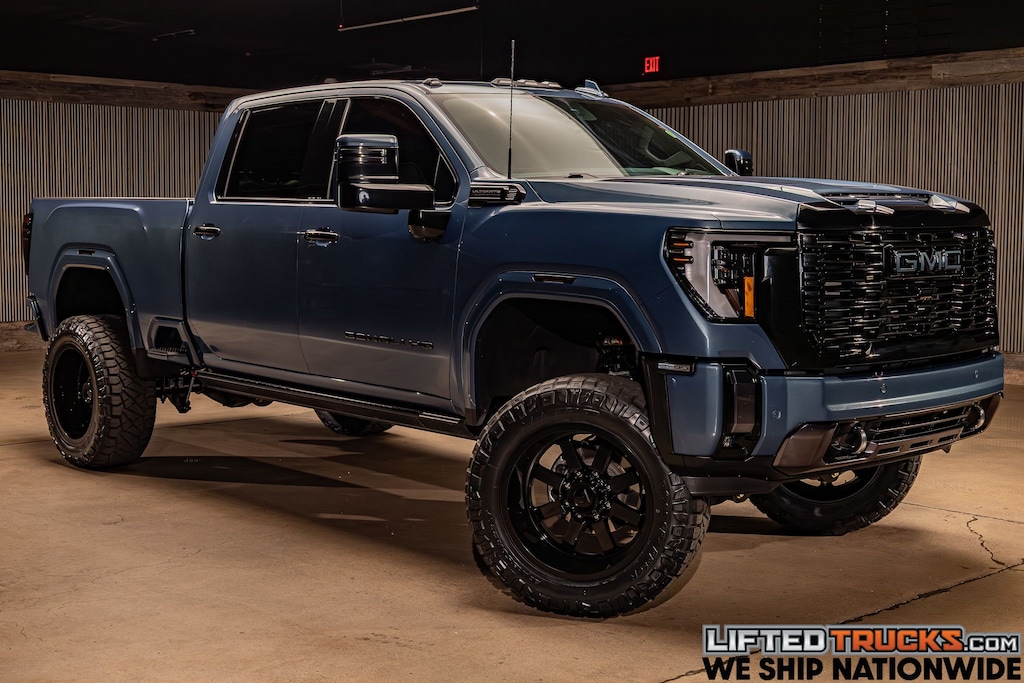 Own the road in the most opulent heavy-duty truck, the 2024 GMC Sierra 2500HD Denali Ultimate Crew Cab 4X4 in Downpour Metallic! Motivated by a TurboCharged 6.6 Liter DuraMax Diesel V8 providing 470hp and 975lb-ft of torque to a 10 Speed Allison Automatic transmission. You can also enjoy Digital Variable Steering and an off-road suspension for a refined ride, even on rugged terrain. A sophisticated, rugged style is standard with LED lighting, a 5-inch BDS Non-Torsion Bar Drop Lift Kit w/Fox 2.5 Elite Series Remote Resi Front & Rear Shcoks and Four Wheel Alignment, 22-inch Fittipaldi Off-Road FA16 Full Gloss Black Wheels, 37X13.50R22 Nitto Ridge Grappler Tires, Custom Paint to Entire Grille, Bumper Inserts, Hood Inserts, Mirror, Door Handles, Door Mouldings, Emblems, All Fender Flares, Custom Smoked Tail Lamps and Mirror Lamps, power-assist steps, a spray-on bedliner, and a MultiPro tailgate with a built-in Kicker audio system.