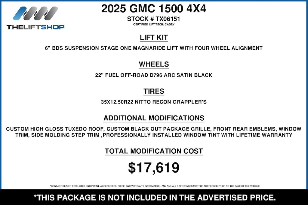 This Lifted 2025 GMC Sierra 1500 Denali Ultimate Crew Cab Short Bed 4X4 includes a 6-inch BDS Suspension Stage One Magnaride Lift with Four Wheel Alignment, 22-inch Fuel Off-Road D796 ARC Satin Black Wheels, 35X12.50R22 Nitto Recon Grapplers, Custom High Gloss Tuxedo Roof, Custom Black Out Package Grille, Front and Rear Emblems, Window Trim, Side Molding Step Trim, Professionally Installed Window Tint with Lifetime Warranty. Installed by our Certified Lift Tech, Casey! *Modifications are optional and are not included in the advertised price.*