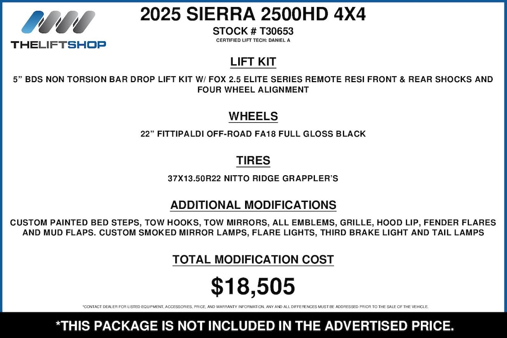 This Lifted 2025 GMC Sierra 2500HD AT4 Crew Cab 4X4 includes a 5-inch BDS Non Torsion Bar Drop Lift Kit w/Fox 2.5 Elite Series Remote Resi Front & Rear Shocks and Four Wheel Alignment, 22-inch Fittipaldi Off-Road FA18 Full Gloss Black Wheels, 37X13.50R22 Nitto Ridge Grapplers, Custom Painted Bed Step, Tow Hooks, Tow Mirrors, All Emblems, Grille, Hood Lip, Fender Flares and Mud Flaps, Custom Smoked Mirror Lamps, Flare Lights, Third Brake Light, and Tail Lamps. Installed by our Certified Lift Tech: Daniel A! *Modifications are optional and are not included in the advertised price.*