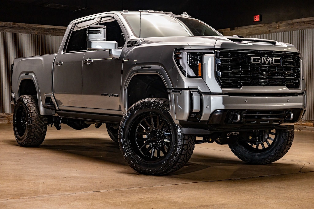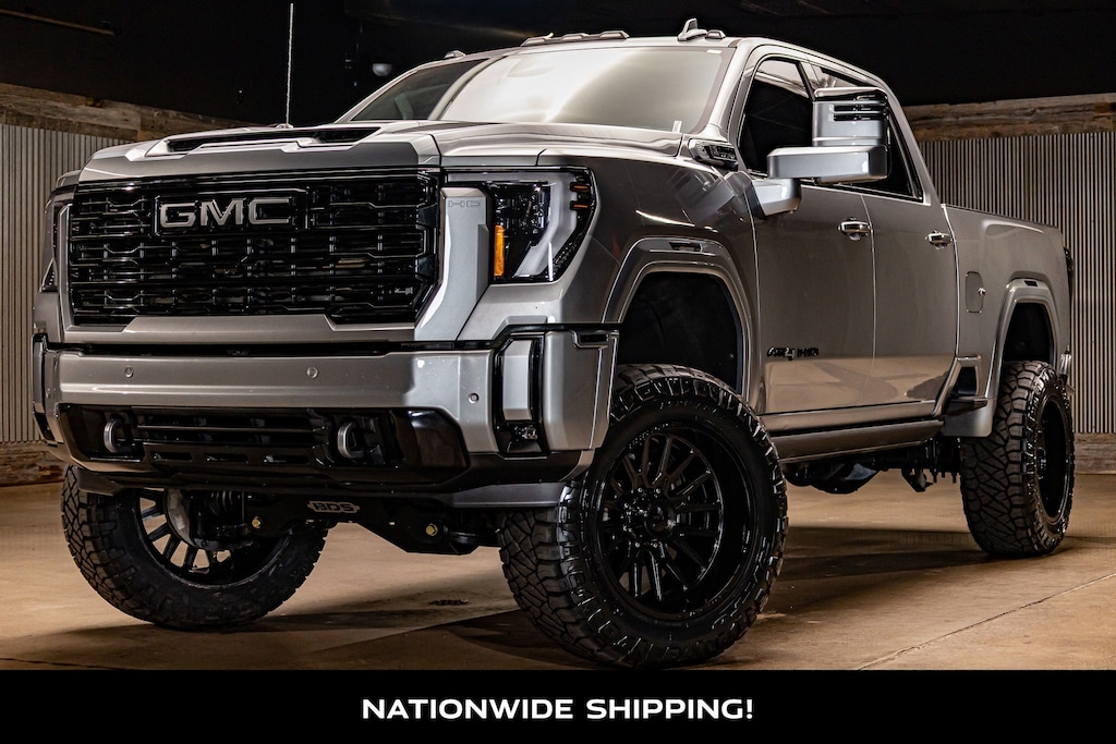 Rugged and Diesel-powered, our 2025 GMC Sierra 2500HD AT4 Crew Cab 4X4 with the Premium Plus Package stands out with a bold and heroic design in Sterling Metallic! Motivated by a TurboCharged 6.6 Liter DuraMax Diesel V8 providing 470hp and 975lb-ft of torque to a 10 Speed Allison Automatic transmission. This Four Wheel Drive truck also features an off-road suspension, skid plates, hill-descent control, and an Autotrac 2-speed transfer case, making it ideal for accessing hard-to-reach jobs. Our Sierra boasts LED lighting, red recovery hooks, 5-inch BDS Non Torsion Bar Drop Lift Kit w/Fox 2.5 Elite Series Remote Resi Front & Rear Shocks and Four Wheel Alignment, 22-inch Fittipaldi Off-Road FA18 Full Gloss Black Wheels, 37X13.50R22 Nitto Ridge Grapplers, Custom Painted Bed Step, Tow Hooks, Tow Mirrors, All Emblems, Grille, Hood Lip, Fender Flares and Mud Flaps, Custom Smoked Mirror Lamps, Flare Lights, Third Brake Light, and Tail Lamps, a spray-on bedliner, off-road high clearance steps, a power-sliding rear window, LED smoked amber roof marker lamps, a power sunroof, and a MultiPro tailgate for high-visibility styling.
