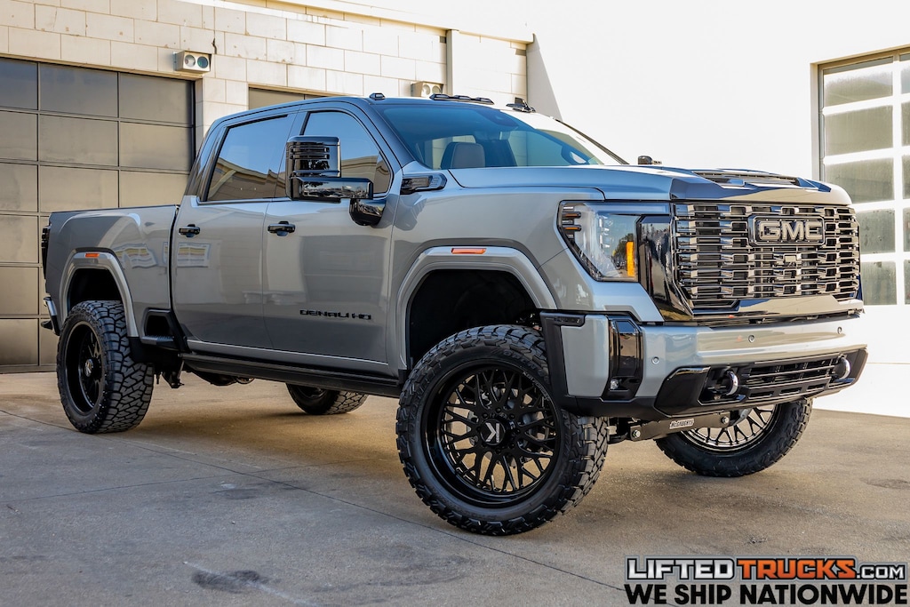 This Lifted 2025 GMC Sierra 2500HD Denali Ultimate features a 4.5-inch McGaughy's Lift with Stainless Inserts, Four Wheel Alignment, 24-inch KG1 Forged KF081 Buckler Gloss Black Wheels, 37X13.50R24 Toyo Open Country Tires, Custom Chrome Delete, a Custom High Gloss Tuxedo Roof Wrap, and Professionally Installed Window Tint with a Lifetime Warranty. Installed by our Lift Tech, Travis. *Modifications are optional and are not included in the advertised price.*