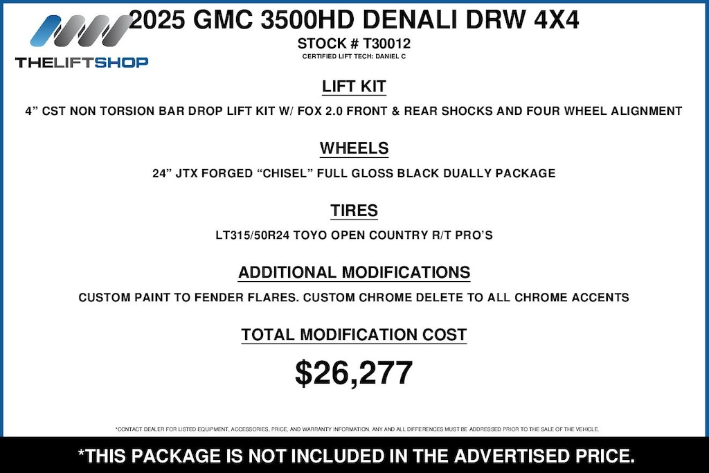 This Lifted 2025 GMC Sierra 3500HD Denali Ultimate Crew Cab 4X4 Dually includes a 4-inch CST Non Torsion Bar Drop Lift Kit w/Fox 2.0 Front & Rear Shocks and Four Wheel Alignment, 24-inch JTX Forged "Chisel" Full Gloss Black Dually Package Wheels, LT315/50R24 Toyo Open Country R/T Pro Tires, Custom Paint to Fencer Flares, Custom Chrome Delete To All Chrome Accents. Installed by our Certified Lift Tech, Daniel C! *Modifications are optional and are not included in the advertised price.*
